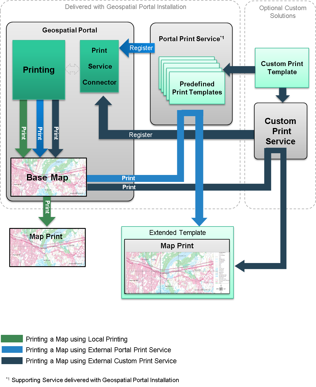 The diagram below illustrates the general idea and logic of the printing process in Geospatial Portal using the Local Printing and supporting print services such as Portal Print Service or other custom print service(s).