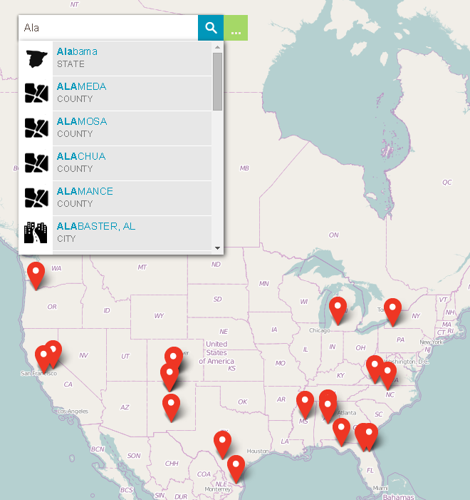 The Consumer Portal Layout gives you the ability to search for geographical objects from defined search sources. Only the administrator can define the search sources that can be used. More than one search source can be connected to the Consumer Portal Layout.