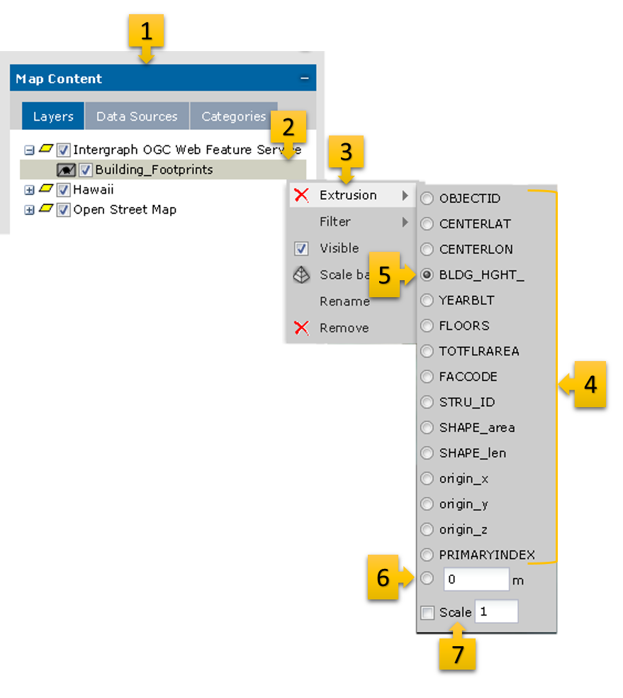 From the context menu, select Extrusion [3]. The list of all available attributes for the given feature class is displayed [4].