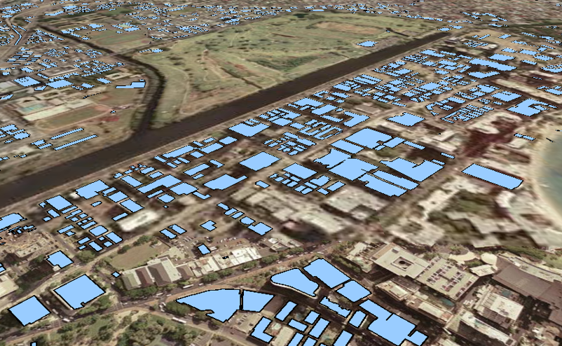 In the pictures below, you can see 2D buildings footprints covering the 3D Map Tiles and the extruded features (3D buildings) created using the Extrusion functionality in Geospatial Portal.